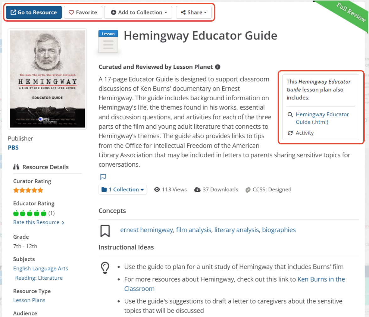 - Add to Collection: Addding this resource to a collection will allow you to start building out your online curriculum within Lesson Planet to either assign out to your students or present it in your classroom (see the articles Build and Edit Collections in Lesson Planet to learn more about Collections)