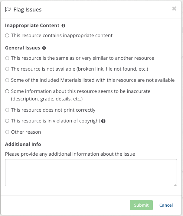 This feature provides a way for you to notify our team about a resource that is not opening properly after clicking on the Go to Resource button. If the resource takes you to either a defuncted link, a blank page, contains incorrect information or shows that it is blocked, flag it for review. The Lesson Planet Team will review the flagged resource to determine what to do with it next.