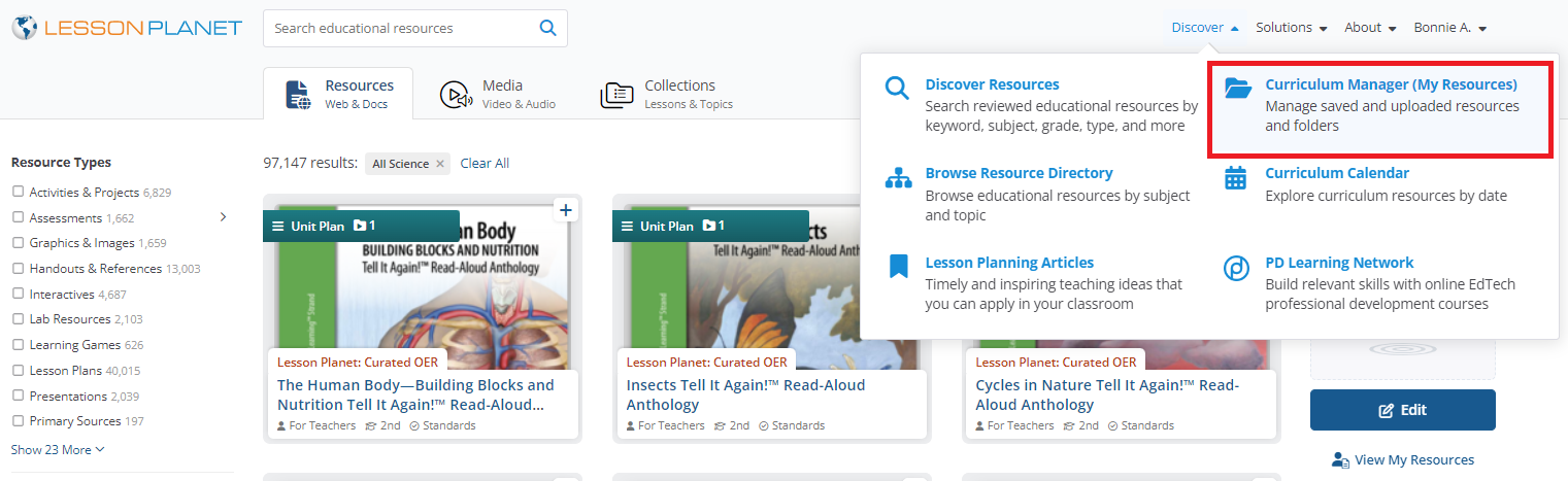 All your favorite and saved resources are in one place, organized the way you want them, and ready for you to grab and go! Your Curriculum Manager (My Content) is personal to you and serves as your hub as you organize your curriculum.