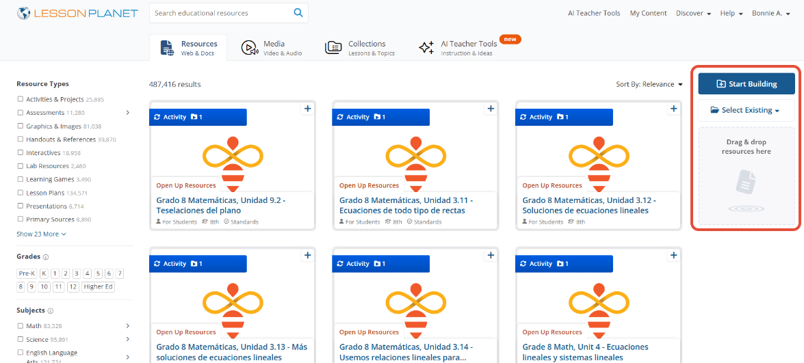 - The first way you can add a resource to your collection is simply to drag and drop. Left click and hold a resource from your search, then drag the resource into the collection that shows up on the right and drop it by releasing the right clicker or you can simply click on that little plus sign in the top right corner of the resource.