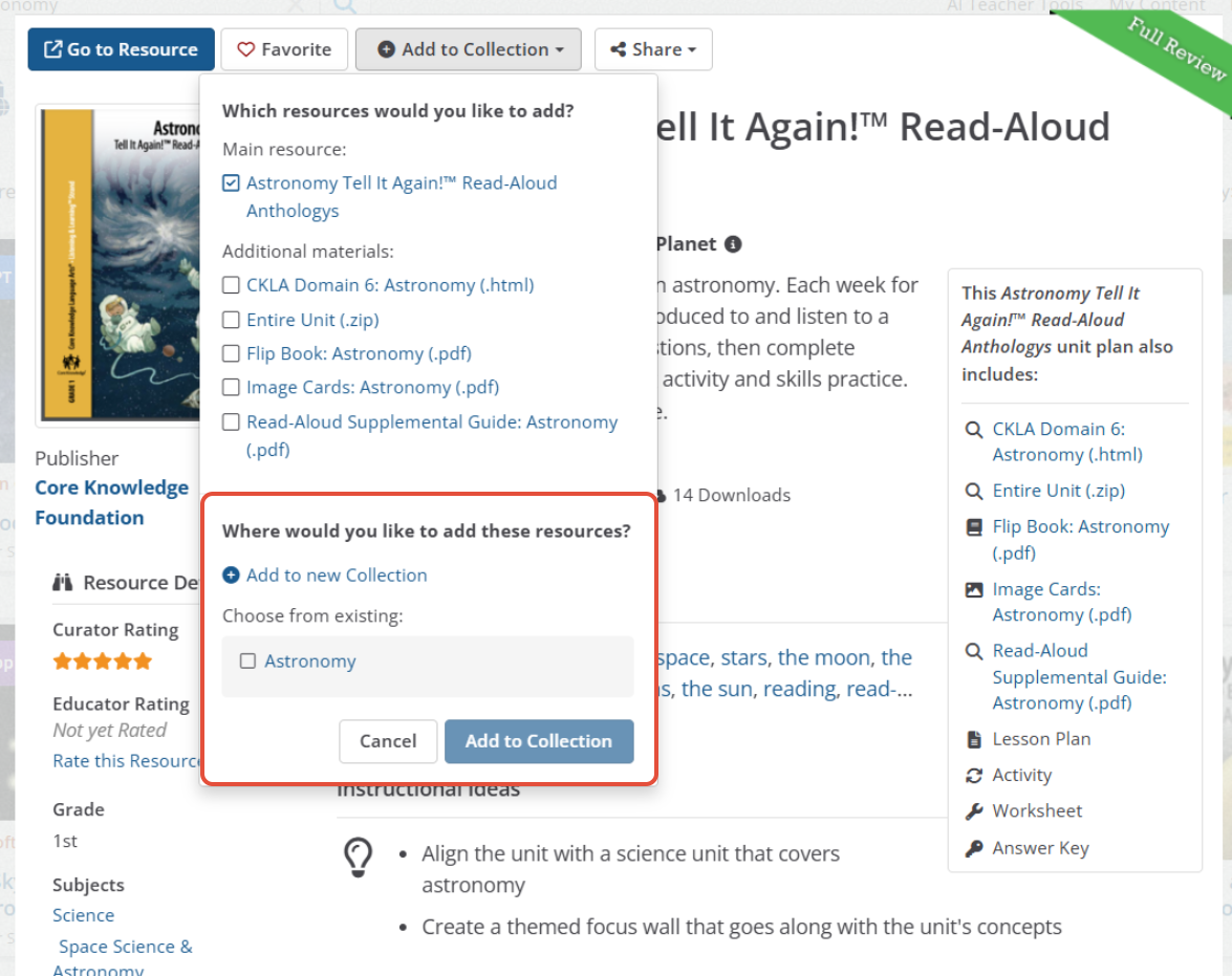 - If there are links to included materials listed in the resource review, you have the option to add those to your collection as well, as seen here.
