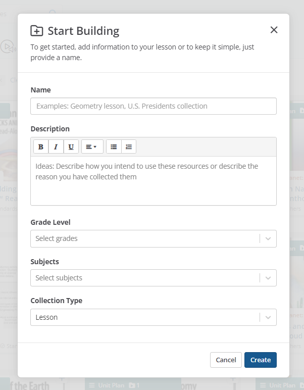 - Fill out some basic information about your collection, including a title, grade(s), subject(s), and a short description(which is not required, but if you do add one and want to change it, you can go back and edit it later).